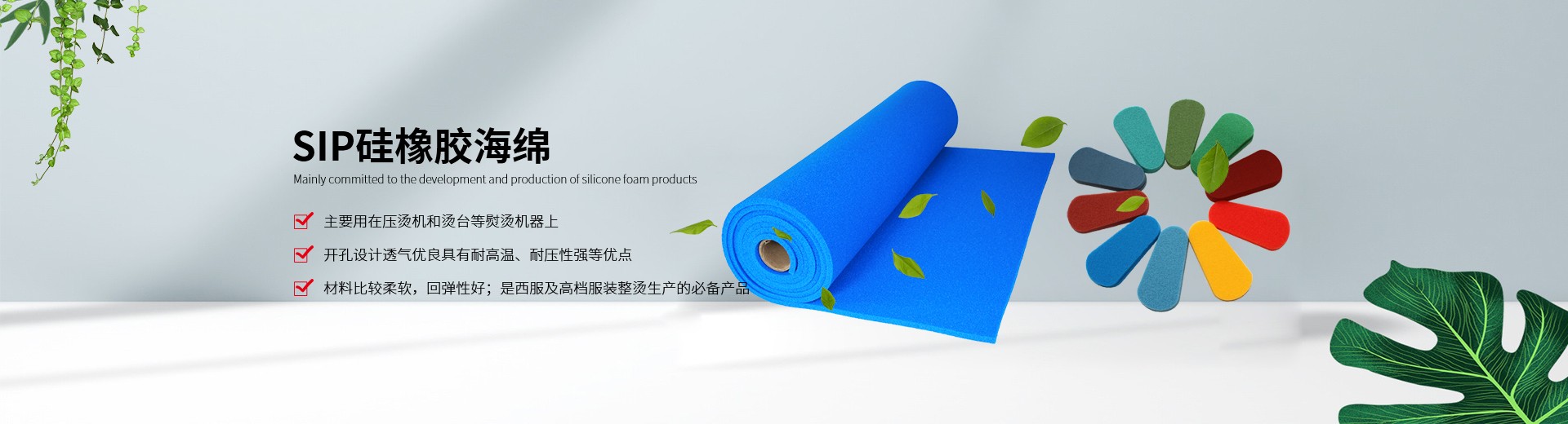 ????我公司生產(chǎn)的硅膠海綿具有耐高溫、耐壓、透氣性能好、抗撕拉、使用壽命長、環(huán)保等特點(diǎn),主要適用于服裝干洗、水洗熨燙設(shè)備,如壓燙機(jī)和燙臺等。另外我們也提供各種燙氈、罩布等整燙專用墊料,客戶可根據(jù)不同熨燙工藝選擇不同的搭配組合,滿足高品質(zhì)的熨燙要求。